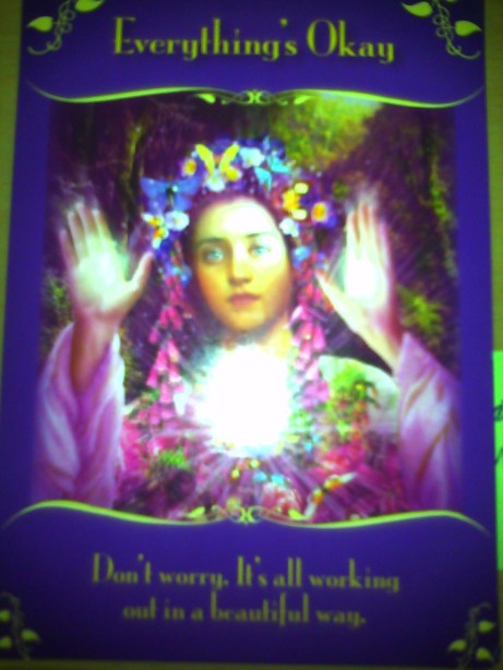But tonight I started idly shuffling Doreen Virtue’s Magical Messages from the Fairies deck. I asked the cards simply, “Is everything okay?,” closed my eyes, and drew a random card. And what did I pull but the card pictured here: “Everything’s Okay.” Um…okay then. Maybe for right now, in this moment, everything really is okay. Maybe everything is all working out in a beautiful way, as this card assures me (in case you can’t see all the lettering, the bottom of the card reads: “Don’t worry. It’s all working out in a beautiful way.”).