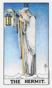 The Fool has really done it this time. He hasn’t just stepped trustingly off the cliff–he’s tumbling head over heels through the air with no end in sight. The Hermit is watching him by the light of a lantern, smiling. Because he knows now that the Fool will be all right.