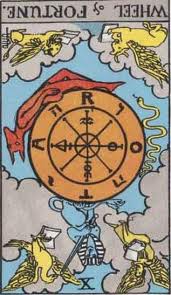 Another two card day — with two reversals! The symbolism in these two cards is not exactly obscure: a relationship turned upside down, possibly by a choice, with emotions running out of these cups everywhere rather than being contained or limited. The Wheel of Fortune throwing us for a loop as well. Everything feels like it is going wrong.