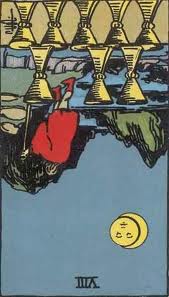 As often happens, I “accidentally” drew two cards instead of one for today: The Star and the Eight of Cups, reversed. Do you see the similarities between these cards? Both are night scenes, illuminated by the heavens (stars, moon). Both involve flowing water (feelings, intuition). The upside-down cups in the reversed eight of cups seems to indicate that our emotions are overflowing–out of the cups and all over the place. That can get overwhelming–and emotionally exhausting.