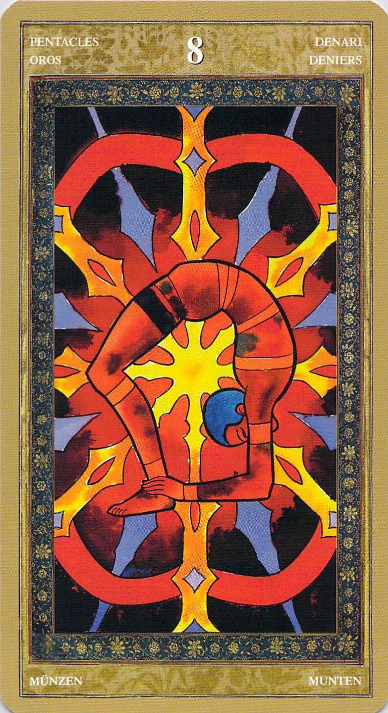 This question could be an apt one for many kinds of defeat. If defeated in battle, you are now liberated from fighting, aren’t you? Can’t fight with ten sword wounds in you, unless you are a Musashi or a Gye Baek. If you have lost a lover, you are now free to love again. If you have lost the unfulfilling job that you hated, you are now free to find one that means something to you, or to create your own as an entrepreneur. Pain brings us liberation in all kinds of ways, and it also brings us flexibility, as we can see from the reversed Eight of Pentacles card that I drew to go with this Ten of Swords. Depending on how you look at the Yoga Tarot’s Eight of Pentacles, you can see a yogi in an extended backbend (upright), or in bow pose (reversed). Either way, this card shows us that though we may not be succeeding on a material level today, we are still laying the groundwork for future success by becoming strong and flexible and by focusing on our breath.