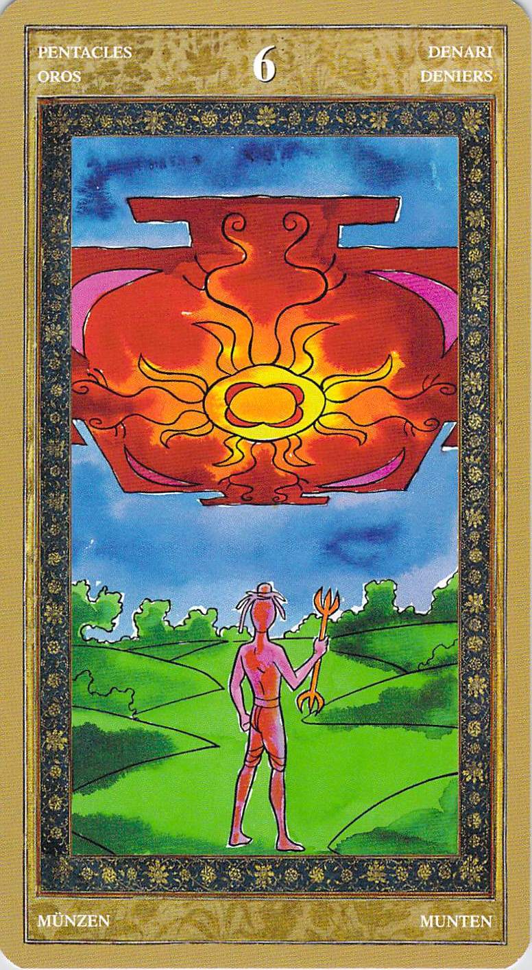 I can’t look at the Yoga Tarot cards without thinking in terms of the chakras — and today, here come two cards with beautiful blues and greens. The colors on these cards look like Earth, from a distance! Yet these cards are both from the suit of pentacles, a suit that speaks to us of root and sacral chakra issues: safety, security, family, physical health. And those lower chakra reds and oranges are present in these cards as well.