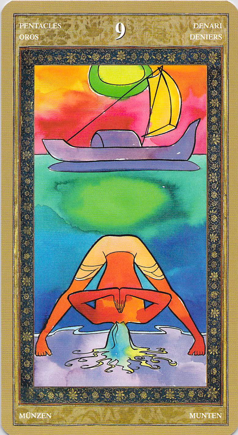 But I am surprised that the artist (Giancarlo Caracuzzo) chose to depict the Nine of Pentacles, which more traditionally shows a woman in a garden with a falcon, in this way, and even more surprised that the artist for the Yoga Tarot (Adriana Farina) also chose a seascape for this card. Notice that in both these cards, we have three main components: sky, water, land. Both cards also show a way of traveling across the water, boats on the Samurai Tarot card and a single junk on the Yoga Tarot card.Nine of Pentacles--Rider-Waite