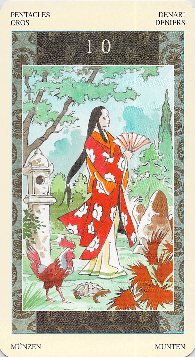 Komachi stands for love, intuition, passion, and making sacrifices for love. The reversed ten of pentacles doesn’t bode well for our finances or investments today. And The Hanged Man also is connected with sacrifice. This particular Hanged Man reminds me of Miyamoto Musashi hanging in a tree (there’s a story for you to look up!).