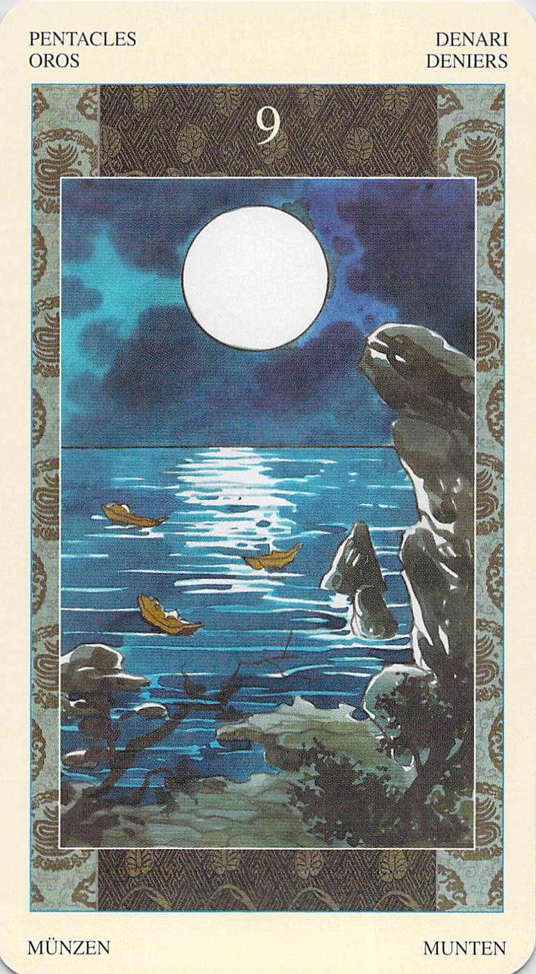 Challenge: Reversed Nine of Pentacles. Though a traditional Rider-Waite deck shows a woman in a garden with a bird for the Nine of Pentacles card, the Samurai Tarot shows fishing boats on an ocean, at night, under a full moon. In this deck, this card is supposed to symbolize rest, and to me it’s emotional rest, rest from the stress of emotional exhaustion. With that full moon, I can’t help but connect that need for rest with psychiatric concerns such as anxiety and depression (or in some cases manic depression). And again, this card is blocked — we aren’t getting that rest, but we need it.
