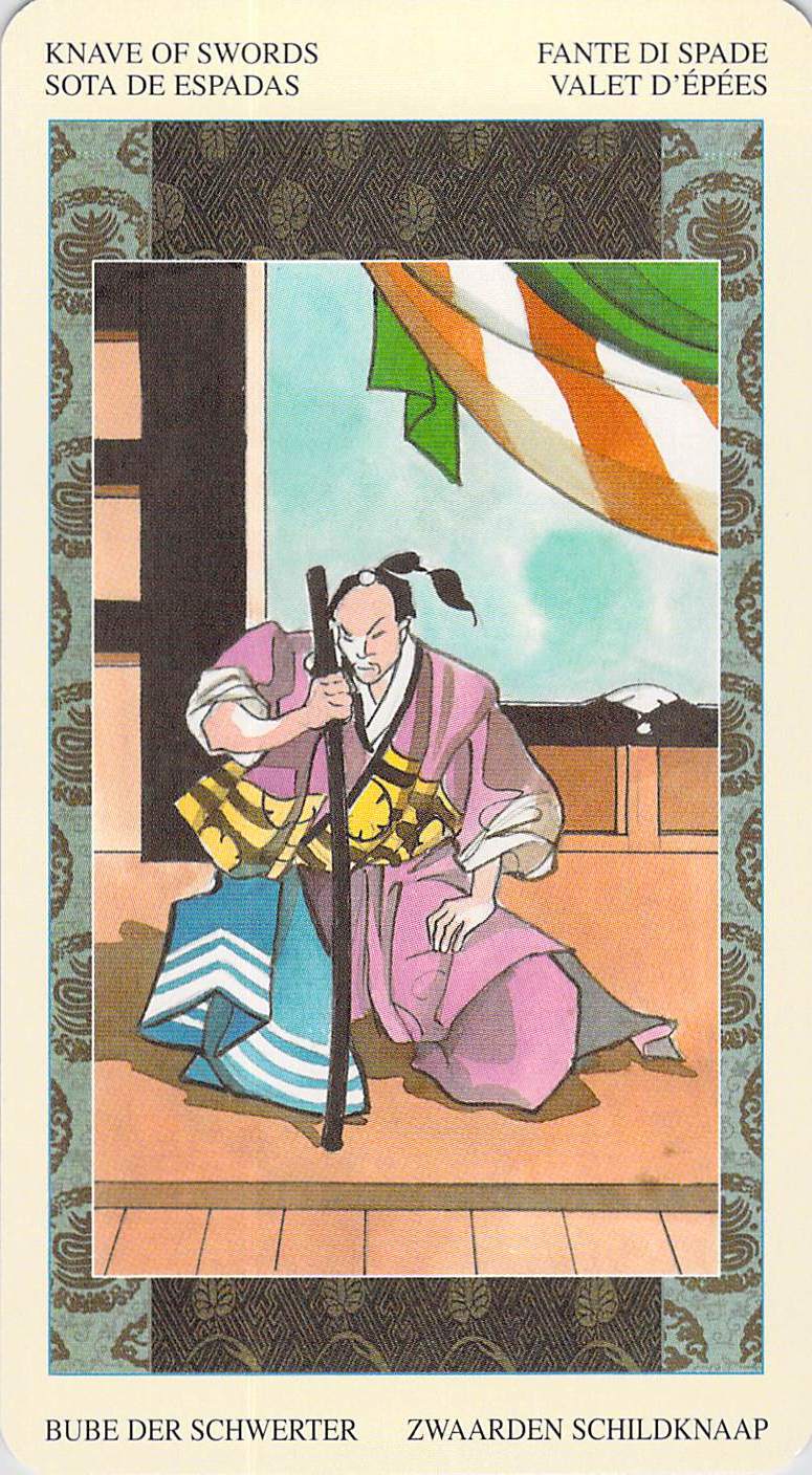 In the Samurai Tarot, the Knave of Swords is depicted as Oboshi Yuranosake, the head of the 47 ronins. If you don’t know the story of the 47 ronins, you may want to look it up–later, when I have one, I’ll post a link to a review of the movie by that name (according to my sources, the review in question isn’t quite up yet as I’m posting this). The story is too complicated to go into right now, but Oboshi Yuranosake is synonymous with loyalty, devotion, vigilance, and top-secret preparations and planning. Along with him (reversed), we have the reversed Four of Swords, which in the Samurai Tarot has to do not so much with solitude and reflection on a single issue (as in the Rider-Waite) but rather with teaching/being taught.