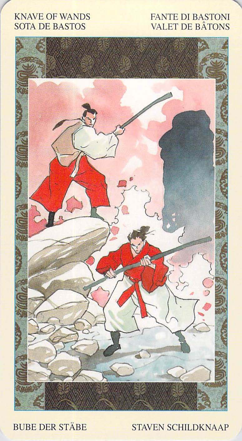 Thank goodness for the Soga Brothers, shown on the Samurai Tarot’s Knave of Wands card. Maybe they will wake us up! When full scale dissociation sets in, we need an alarm clock, or something. Something to shake us out of it and wake us up. I’m hopeful that this reversed Knave heralds a wake up call from somewhere — some message, even a negative one, that shakes us out of our reverie and gets us moving again. If not, then we need to wake ourselves up — because the world is full of challenges that we cannot adequately meet unless we are awake.