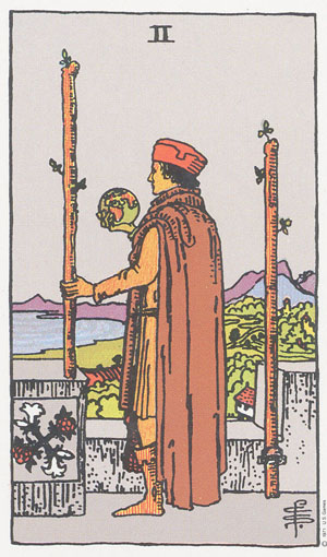 So, if you are currently hanging upside down, take time to be the Two of Wands, and look ahead. Make your choices. What is your world going to be? Consider.