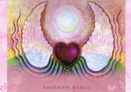 According to the Universal Wisdom guidebook, Rainbow Wings are the wings of an angel, there to encourage us to follow our hearts and not be discouraged. The Om card is an encouragement to use the sound “Om” during meditation, to clear and balance our seven major chakras (shown on the card as well–another rainbow).