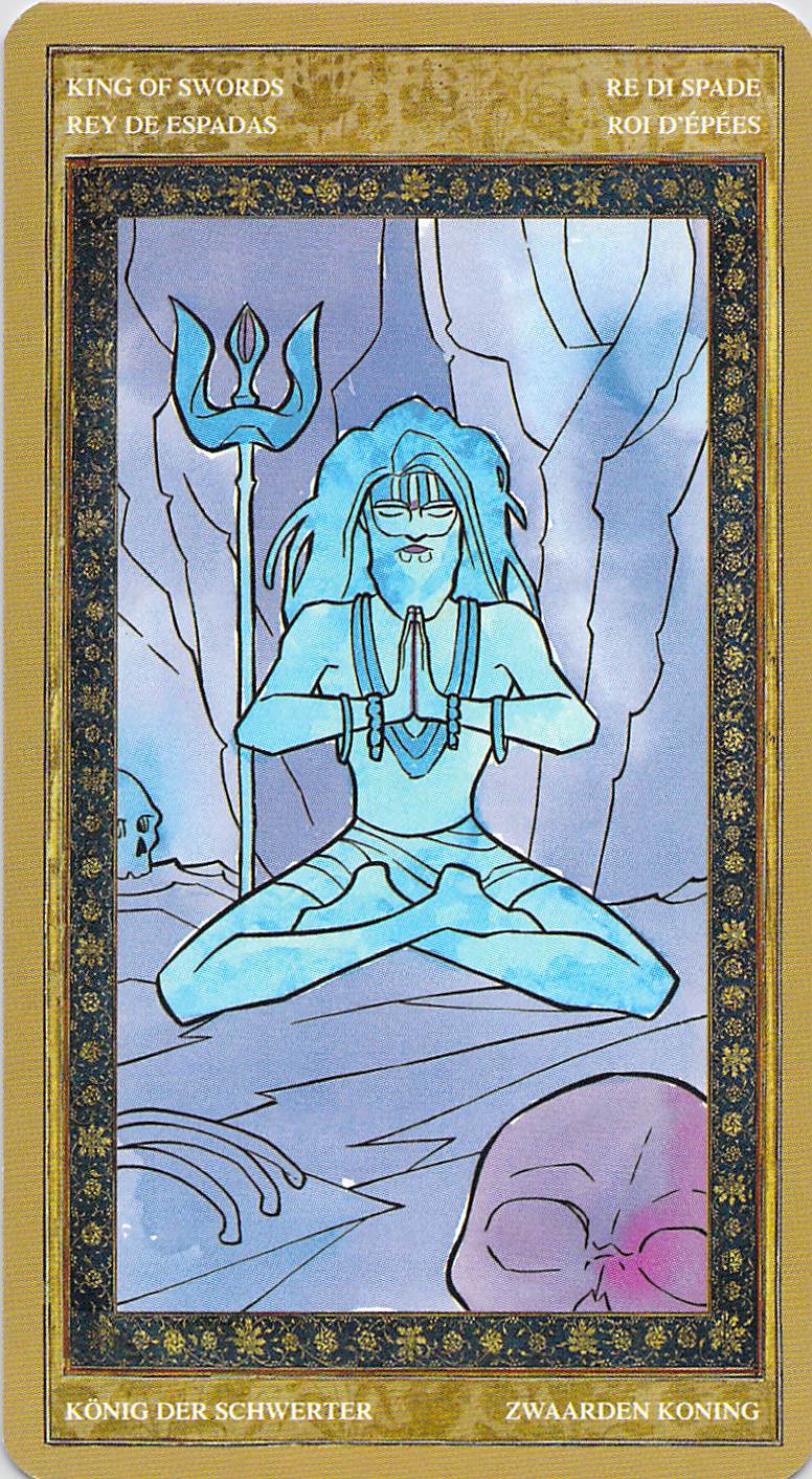 ARE you ready? Because knowing the world means getting hurt. Being in the world, acting, loving…this leads to getting hurt. That doesn’t mean that acting and loving are unsafe or bad things to do!!! Quite the contrary. But it means that we may have to take a bodhisattva-like attitude toward pain, and be willing to be hurt for the sake of all sentient beings (you don’t have to be a Buddhist to do this–all you have to be is a person who cares). And it is, in fact, possible, to purify your pain and make it hurt less or have less of an edge, if you take that pain and offer it to all beings, as a dedication. Be careful not to misunderstand what I am saying — this is not a teaching of masochism. It’s NOT a matter of seeking out pain. It’s a matter of dedicating all actions and feelings, not just the pain but also the joy, for the sake of all beings. This practice can do a lot to make our lives feel quite a bit better. It lifts us into a different perspective. It soothes the pain out of our hearts. And it causes the obsessive Ten of Swords thoughts to transform into the peaceful resolution of the King of Swords, shown here sitting in a violet cave, not only peaceful and resolute, but having achieved that peace through having been pierced by the Ten of Swords and having worked through it to find the real truth of the matter.
