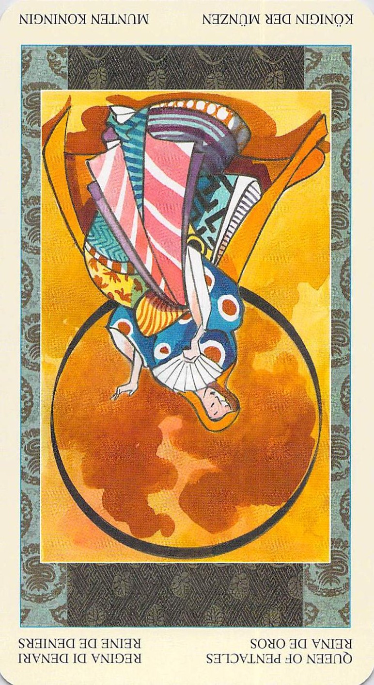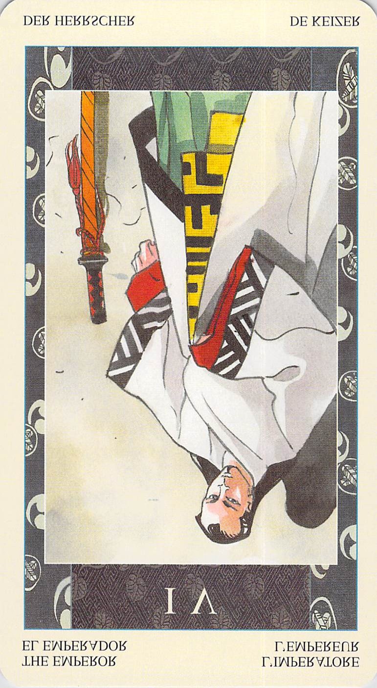 From the Samurai Tarot, I pulled The Emperor and the Queen of Pentacles, both reversed. What was this calculating couple discussing? Justice reversed (which you may recall came up on Friday as well). Looking for further background, I pulled the reversed Five of Wands.