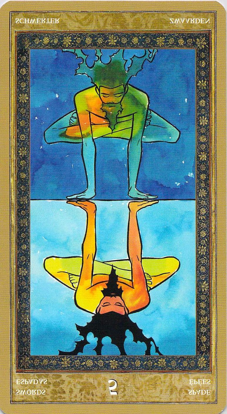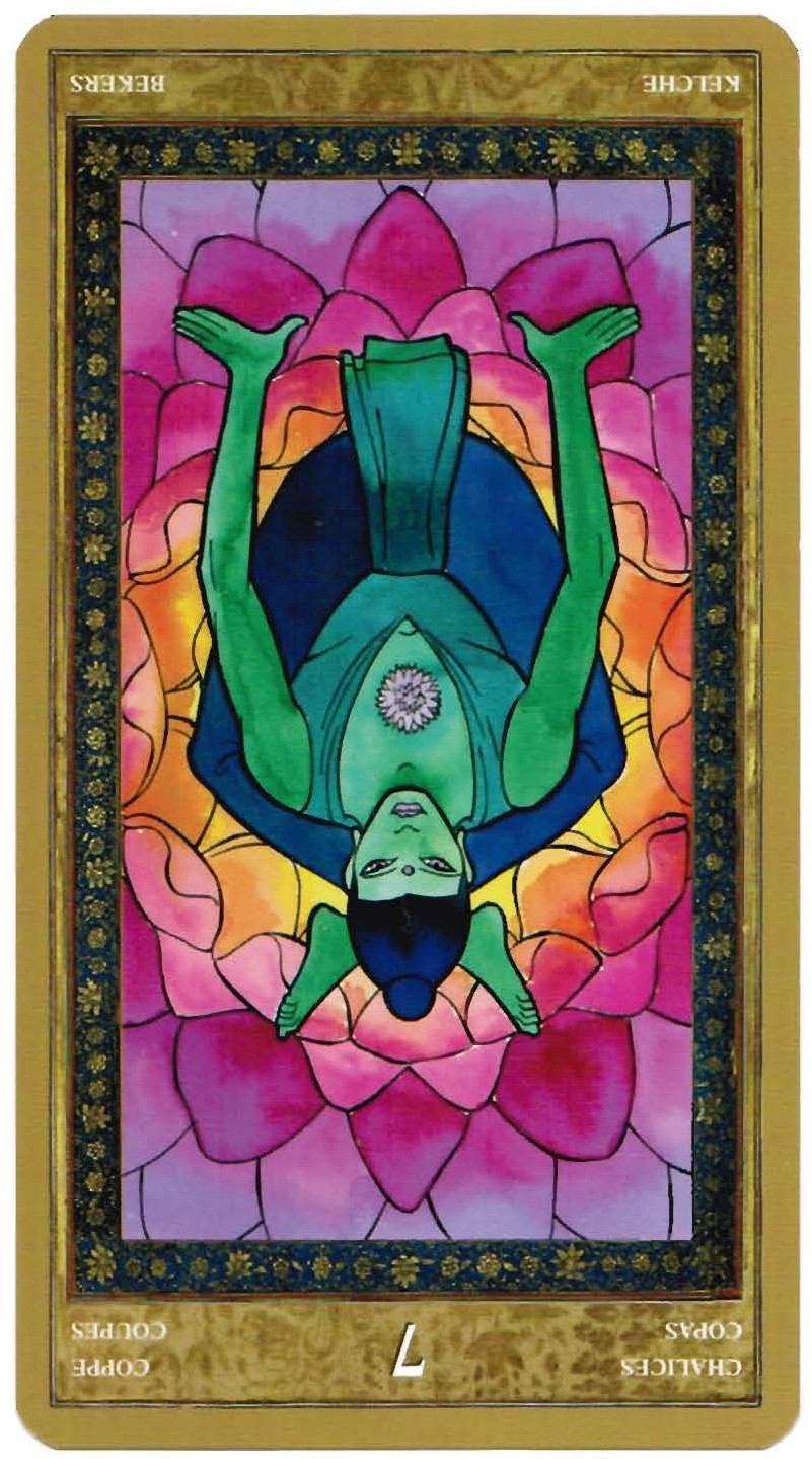 What’s tying us up in knots today? What are we reflecting upon? Today’s cards, from the Yoga Tarot, have to do with looking inward and self-reflection, but, also are connected with pain and health problems, especially inflammation. Though the background of the Yoga Tarot’s Seven of Cups is meant to show a close-up of a lotus, to me this card has always looked like body cells that are inflamed and sore, and the green yogi doesn’t look like he belongs there. It seems as though some irritant is causing inflammation in a tube-shaped part of the body–of which there are many: blood vessels, intestines, the throat, the alveoli in the lungs, or maybe even parts of the sinuses. It also seems to me as if the green yogi looks like Mercury (the feet behind his head look like wings) — and we’re in the middle of Mercury retrograde (which will be over July 20). During Mercury retrograde, things that have bothered us in the past often flare up, so I wonder if old health concerns are likely to flare up today. With the blues depicted on the Five of Swords card, I also feel as though there is a part of this situation that involves being honest with ourselves — speaking truth to ourselves about our own health. Or possibly simply a throat condition unrelated to what we actually are saying.