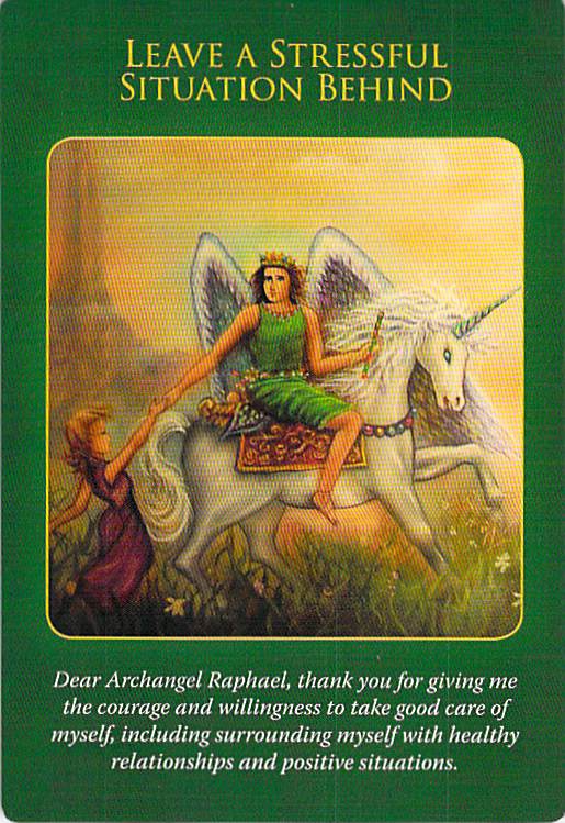 Because I see a lot of health concerns in these cards, I drew a third card from a deck focused on healing, Doreen Virtue’s Archangel Raphael Healing Oracle Cards: Leave a Stressful Situation Behind.