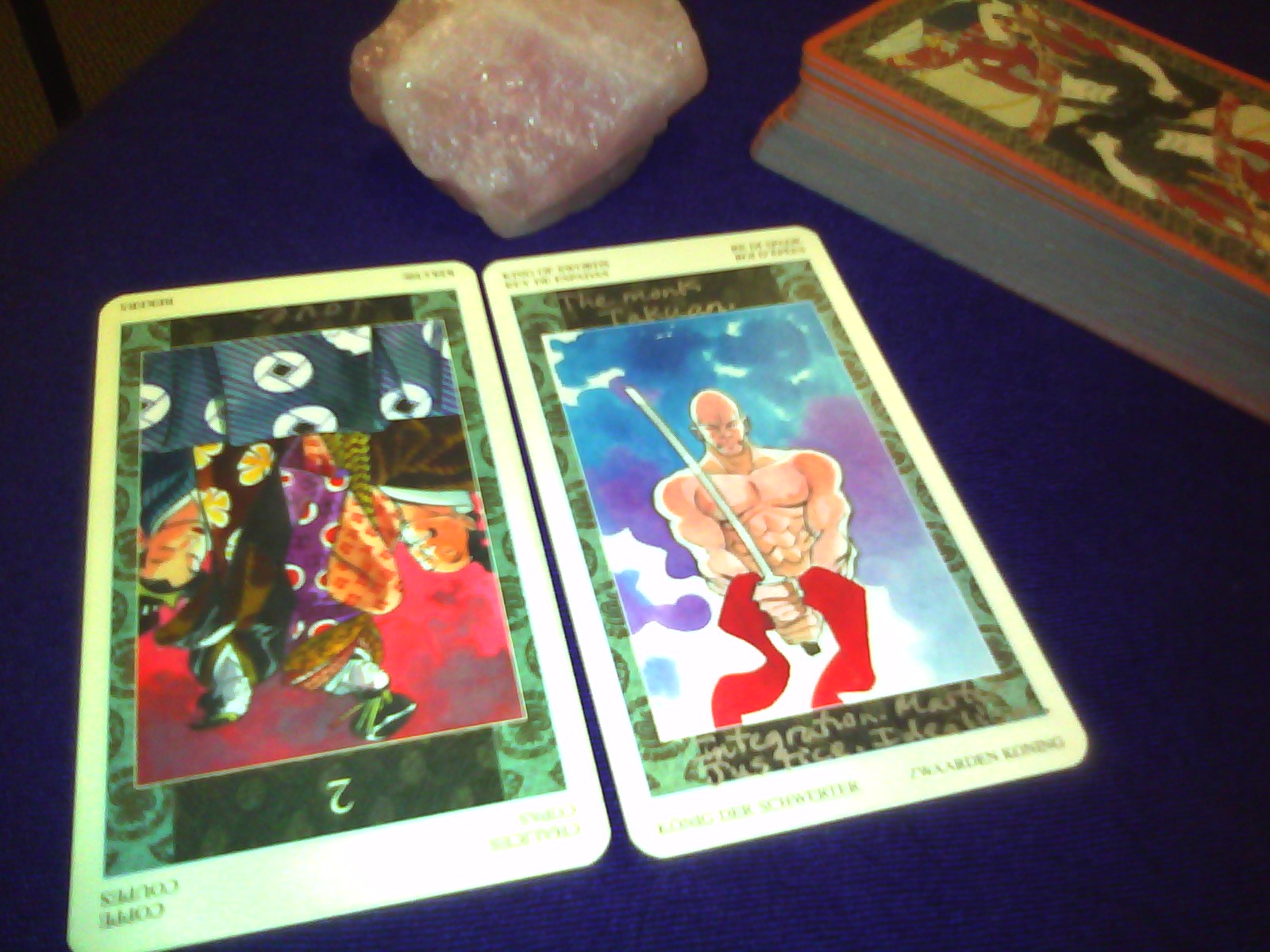“All’s fair in love and war”? No. It isn’t. If there was ever a time to be true and faithful to your ideals, it is in matters of the heart (Two of Cups). There is no better time to be idealistic (King of Swords — in this case, the monk Takuan).