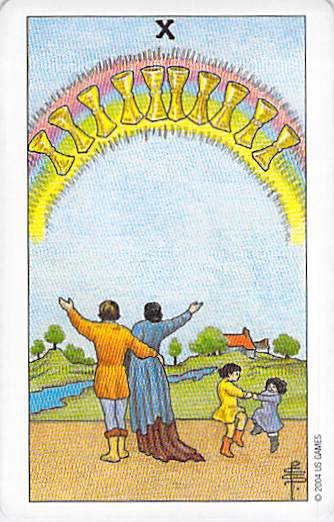 Answer: Eight of Pentacles, Ten of Cups. What’s the story here? I see two messages in these cards. The first is that working hard is a pretty good route to manifestation. It’s not all about wishing!