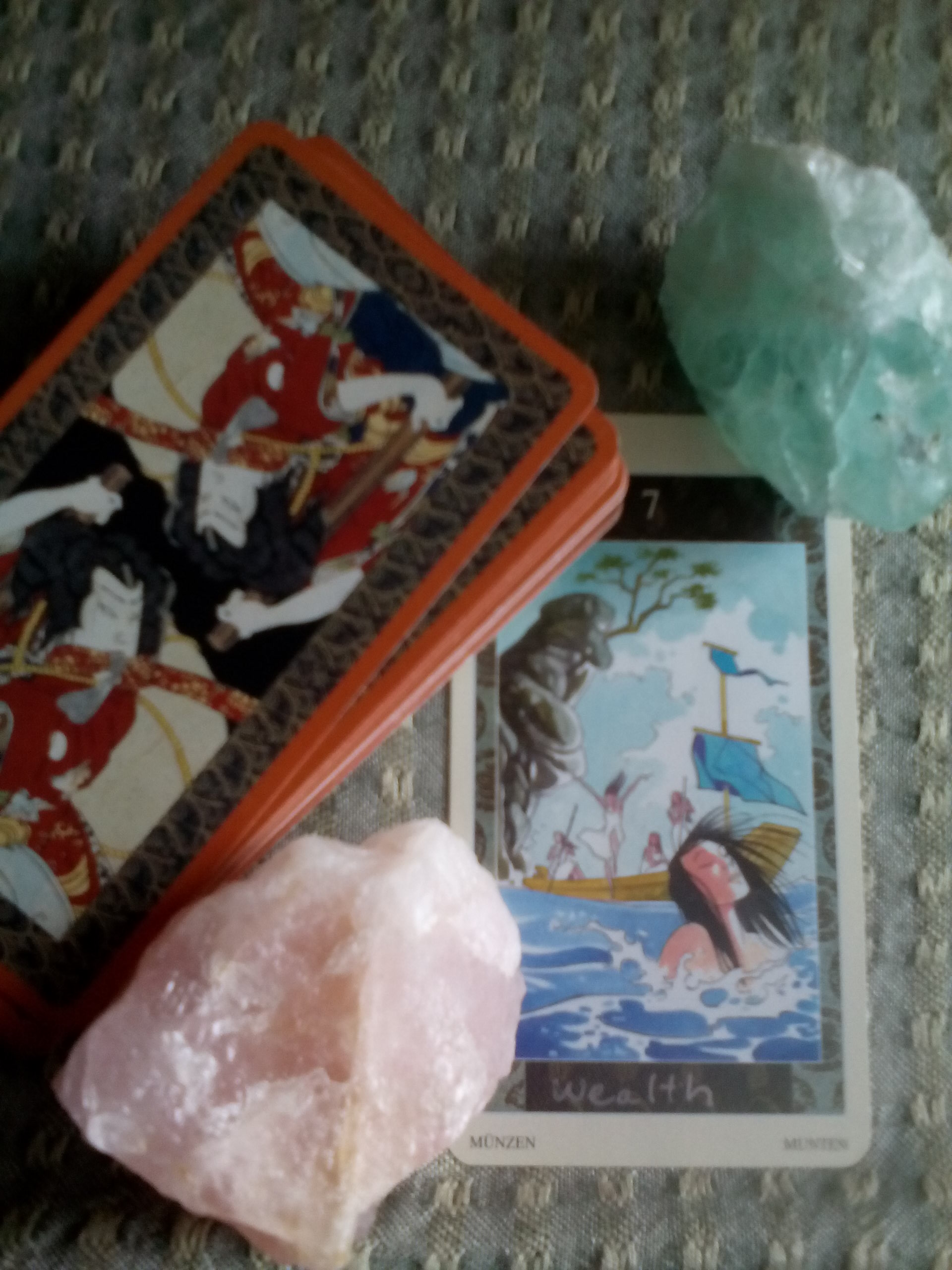 In the Samurai Tarot, this card represents wealth, which (sigh) means that it is a card that is likely to be instantly misunderstood. What does wealth mean to you? Assess your own views on the matter. Because I don’t see a coin on this card, anywhere. I see a beautiful, inviting ocean. I see a tree growing out of a large stone. And I see women jumping happily from a secure boat in a calm sea into that inviting water. What does this say to you about wealth? We have to be very careful in speaking about wealth, as I noted above, because it is so easy to be misunderstood. On the one hand, all we have to do is step outside into nature to realize that we already have all the wealth we need. On the other hand, we do have a legitimate need for the safety and security that actual money brings in terms of making it possible to have a roof overhead.