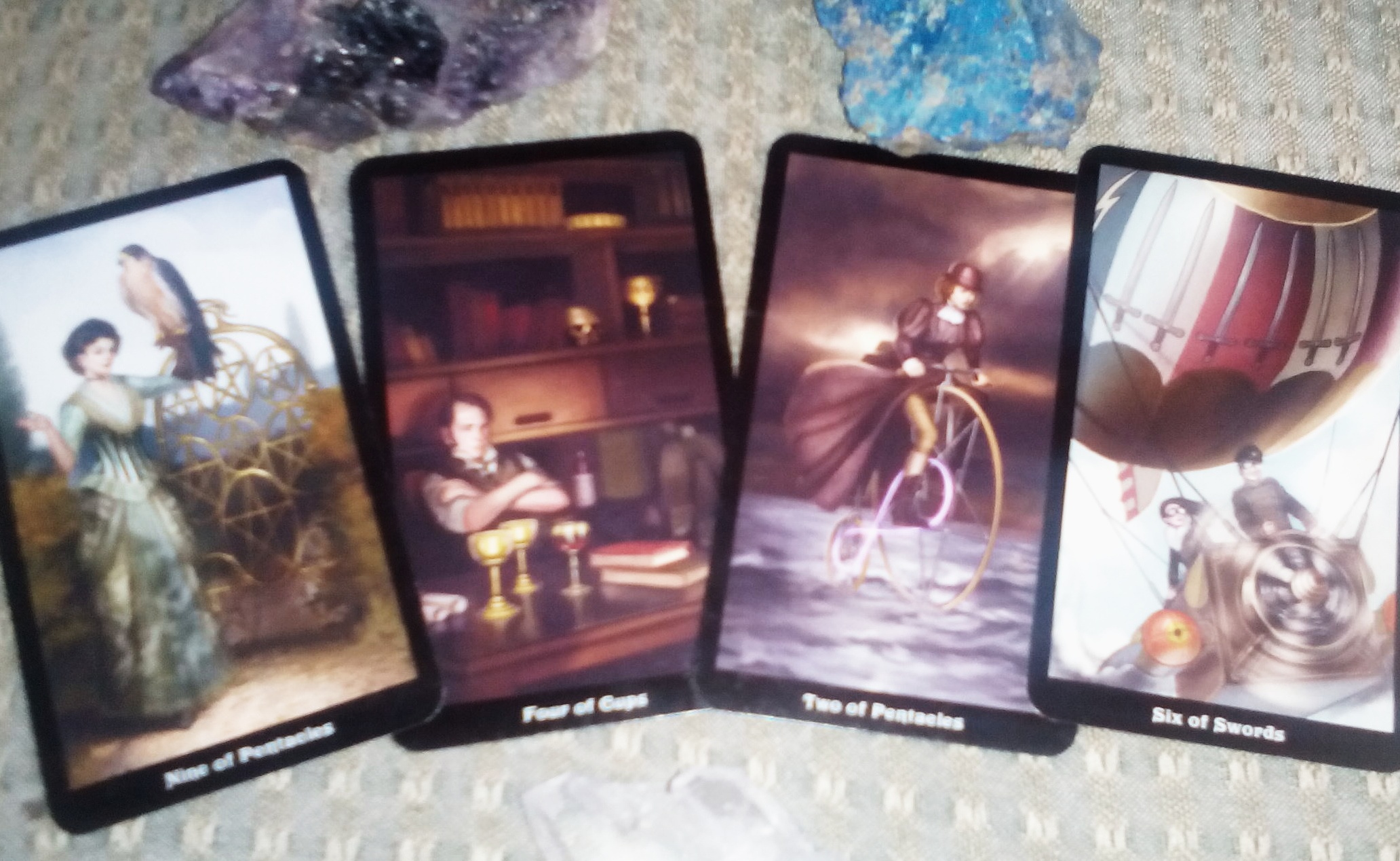 But I couldn’t stop there. I had to think about what cards represent riding the bus. While The Chariot can represent travel by car, I feel that the bus is more of a Six of Swords mode of travel. It seems to me that the crafts generally depicted on a Six of Swords card can hold more people than the Chariot could. I also connect the Four of Cups (boredom–I don’t get bored on the bus, but many people do) and the Two of Pentacles (multitasking!) with a bus ride. But most importantly, to me, the bus is a blessing that gives me independence and the ability to travel even though I don’t have a car right now–and to me, that’s a Nine of Pentacles moment.