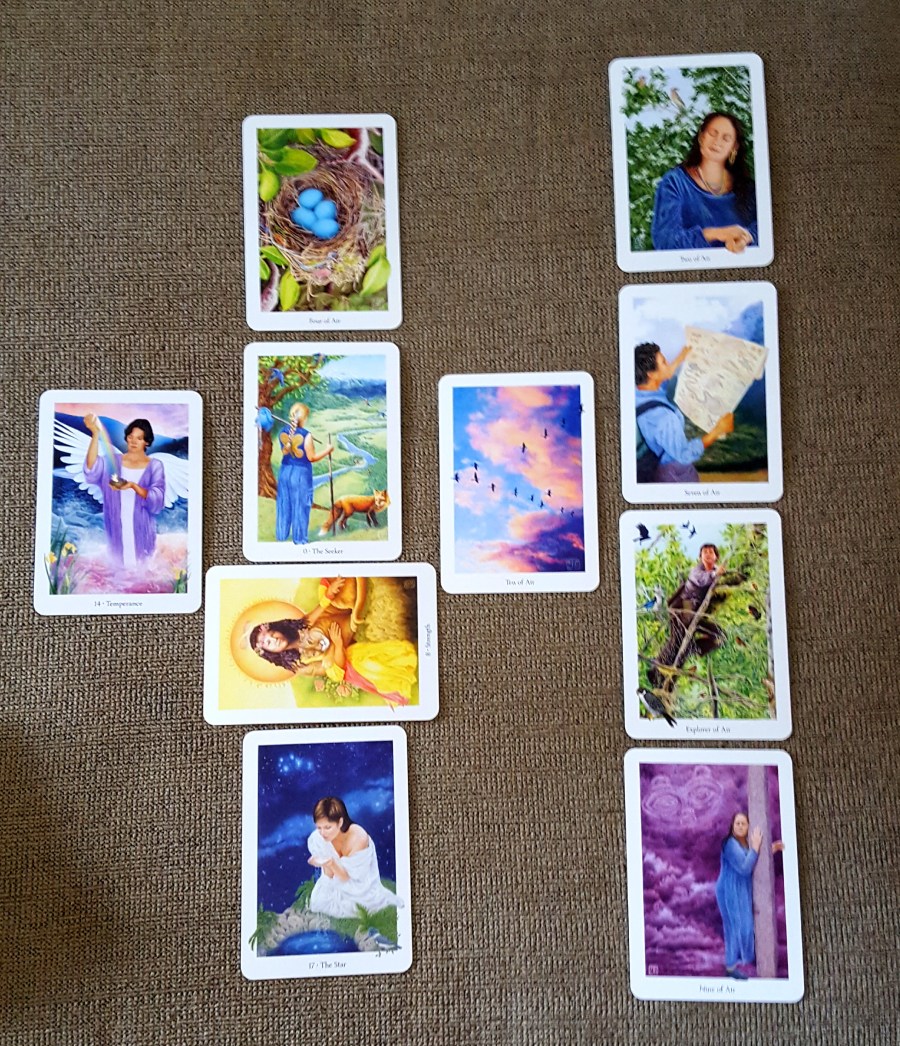 Leaving aside the next three cards for a moment: let’s look at us, in the bottom right: the Nine of Air (reversed): worry, anxiety. A raccoon watches from the clouds. We are worried and rightly so.