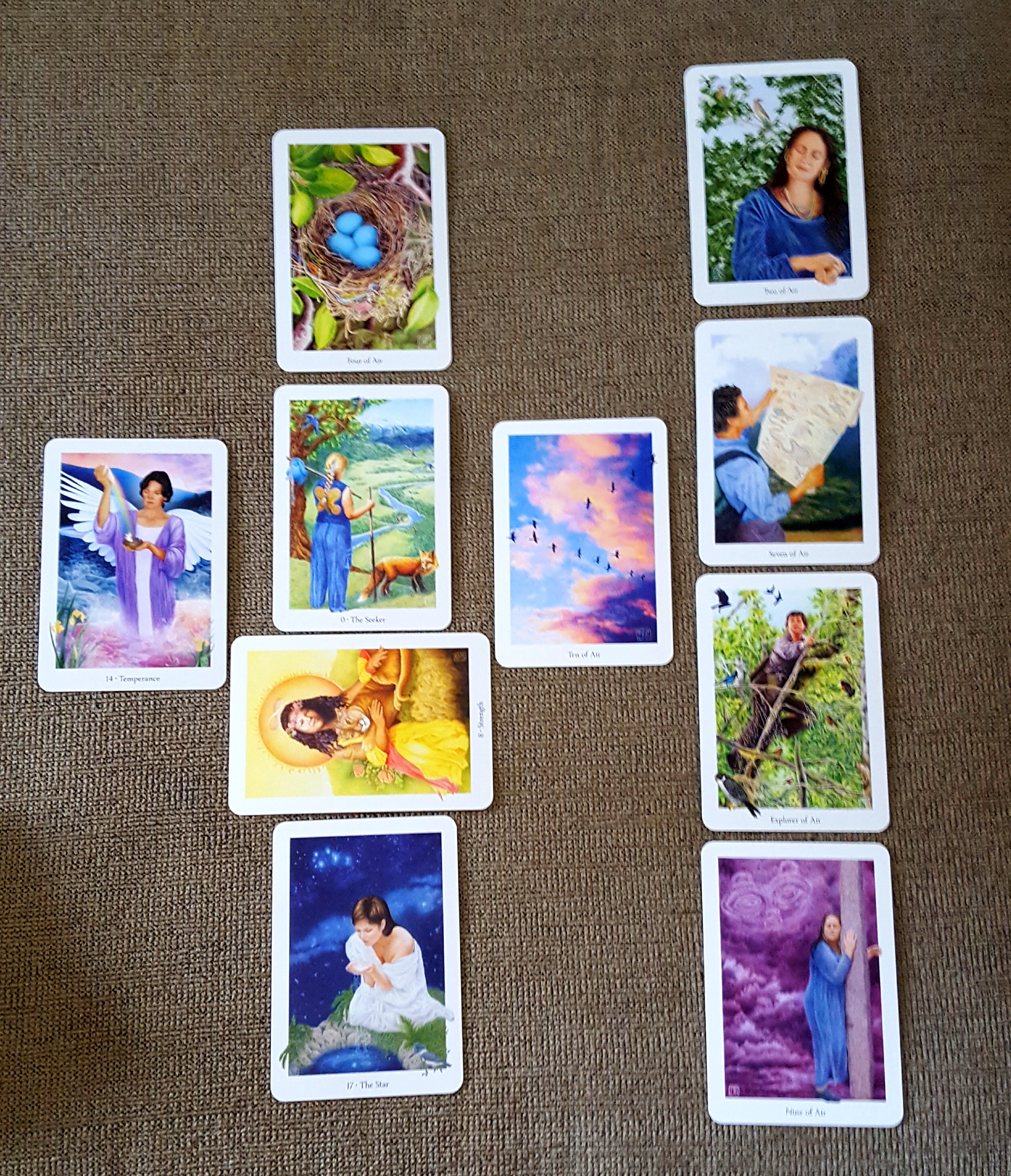 The day after Independence Day, I suddenly felt moved to do a reading for the United States. I pulled out the Gaian Tarot and shuffled very mindfully and very, very thoroughly. The first four cards I pulled were majors: The Seeker (aka The Fool), Strength, The Star (reversed), Temperance (reversed). After that I pulled nothing but Air (Swords): the Ten of Air (reversed), the Nine (reversed), the Explorer, or Knight (reversed), the Seven, and finally, the Two (reversed). Lots of birds on these Air cards, for obvious reasons.