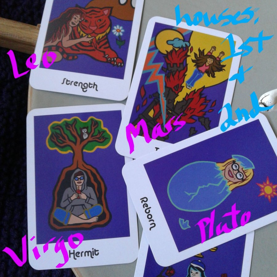 Now, it’s always puzzled me that I have Leo rising, because I don’t feel like a fiery leader. But when I look at my chart in pictures via the Hip Chick Tarot, and see Strength snuggled up with a Tiger, it makes perfect sense. Because I do have Leo in my first house, but just for a few minutes, and the rest of that house is filled up with a Virgo Hermit. So now I’m seeing myself, especially looking back at childhood, as a quiet kid who just wanted to hang out with my cats. Accurate.