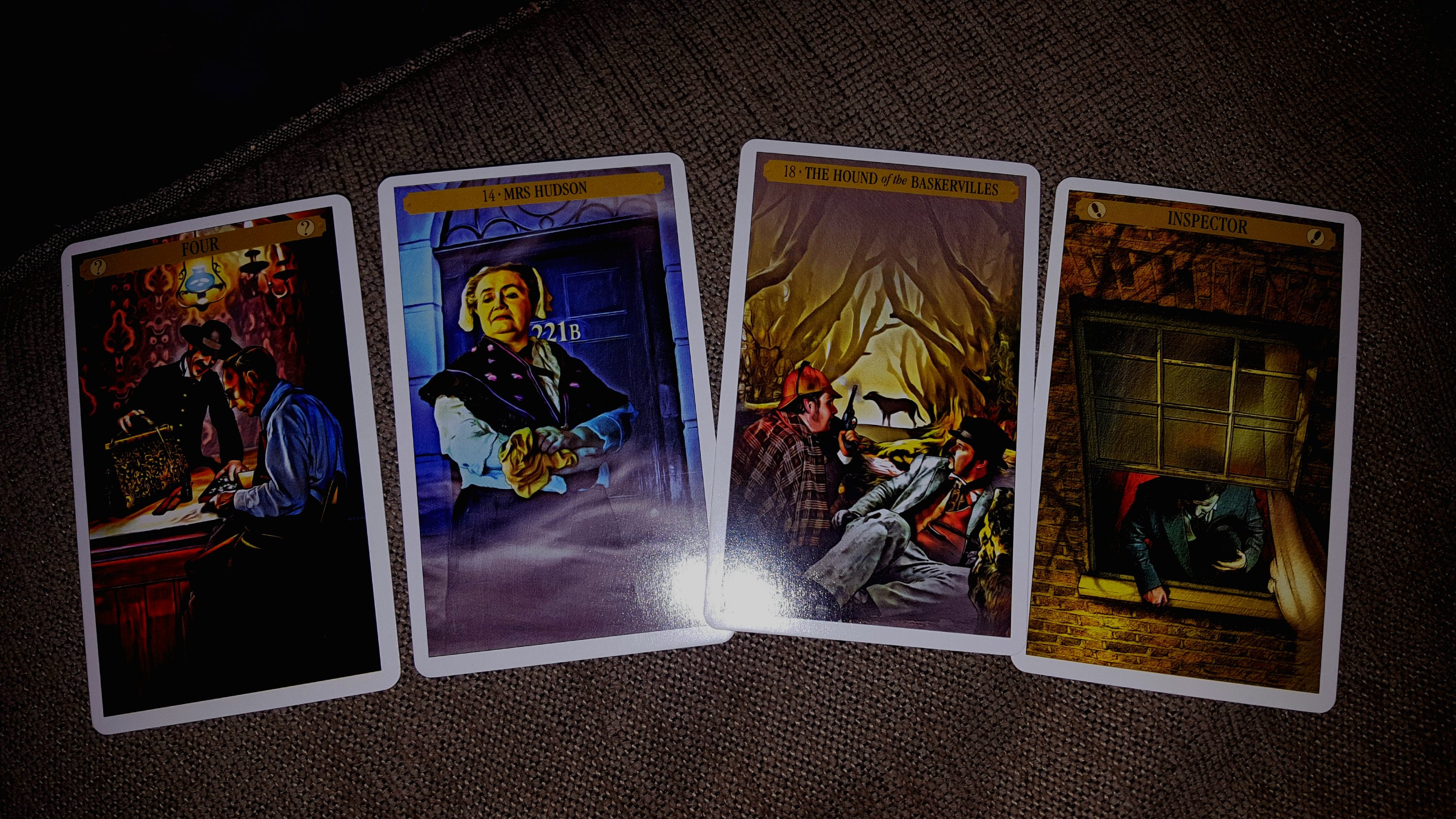 What I’m fascinated by, here, is that three of these four cards shows doors or portals of some sort. Mrs. Hudson stands in front of her door. The Hound of the Baskervilles shows a path almost like a tunnel through the forest. And the Inspector stands looking out a window.