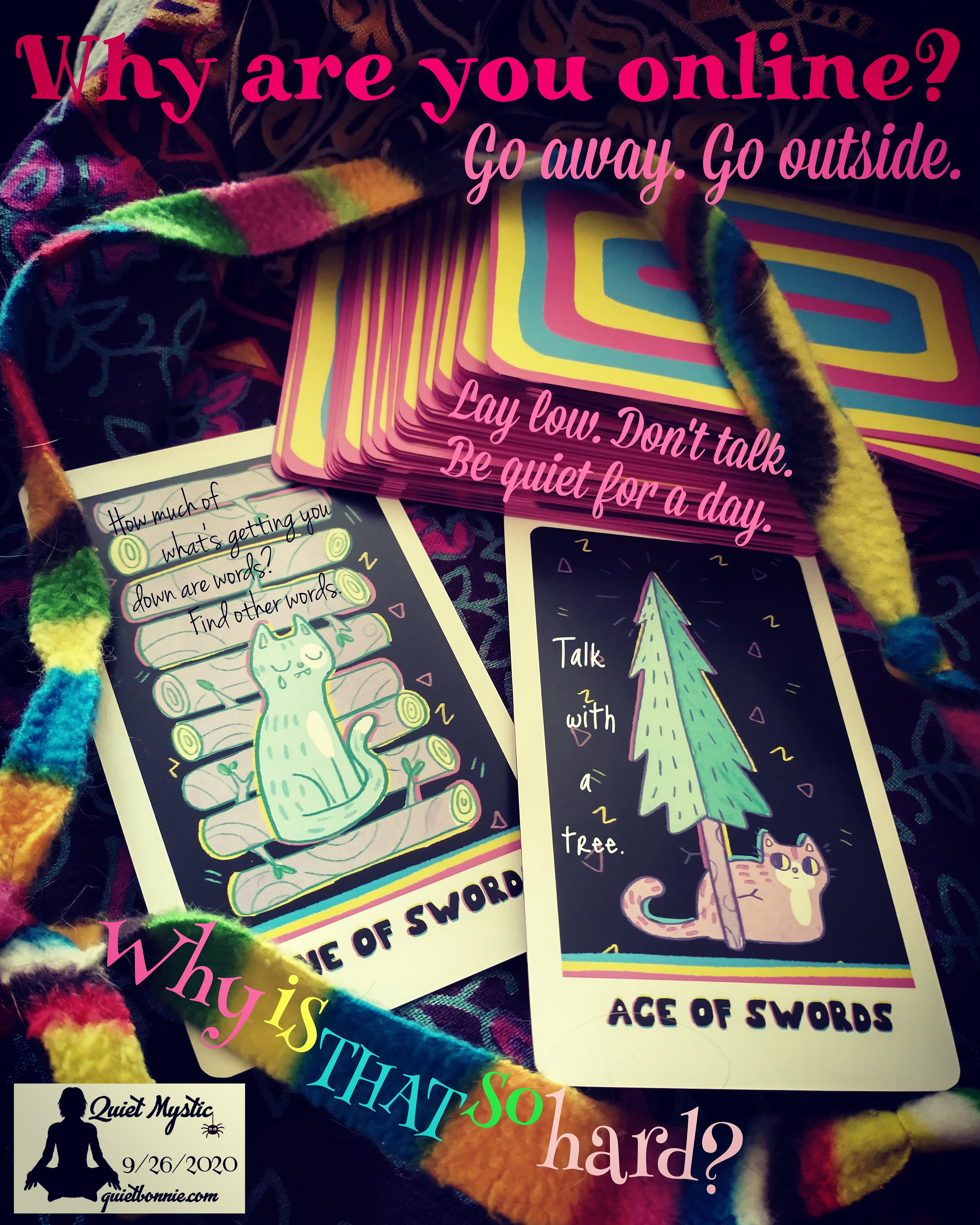 A short reading today but good advice, I think. Go offline and be quiet for a day. Just STFU. Be quiet. Enough words for now. It’s mostly bluster and bullshit anyway. (That’s not always true, but there is an exceptional amount of it at the moment.) Don’t waste your time on it. Don’t offer a single minute of your life as a sacrifice to those who do not have your best interests at heart and are puffing up like skittish cats. And don’t you puff up like a skittish cat either. Just stop. For one day? Is that possible?