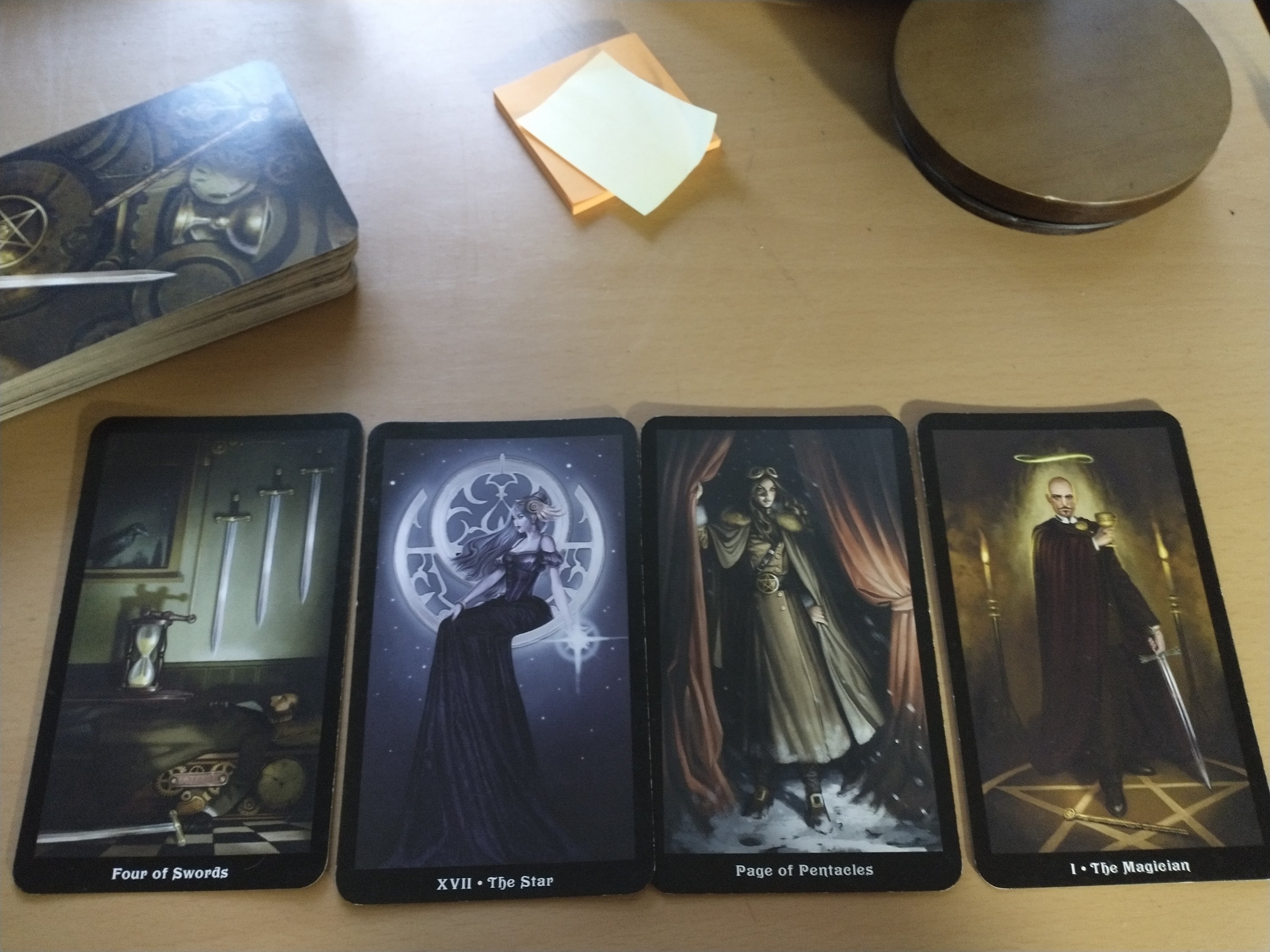 Four cards: situation (Four of Swords) what to know (The Star), advice (Page of Pentacles), outcome (The Magician). I don’t have time for a long post so very quickly: