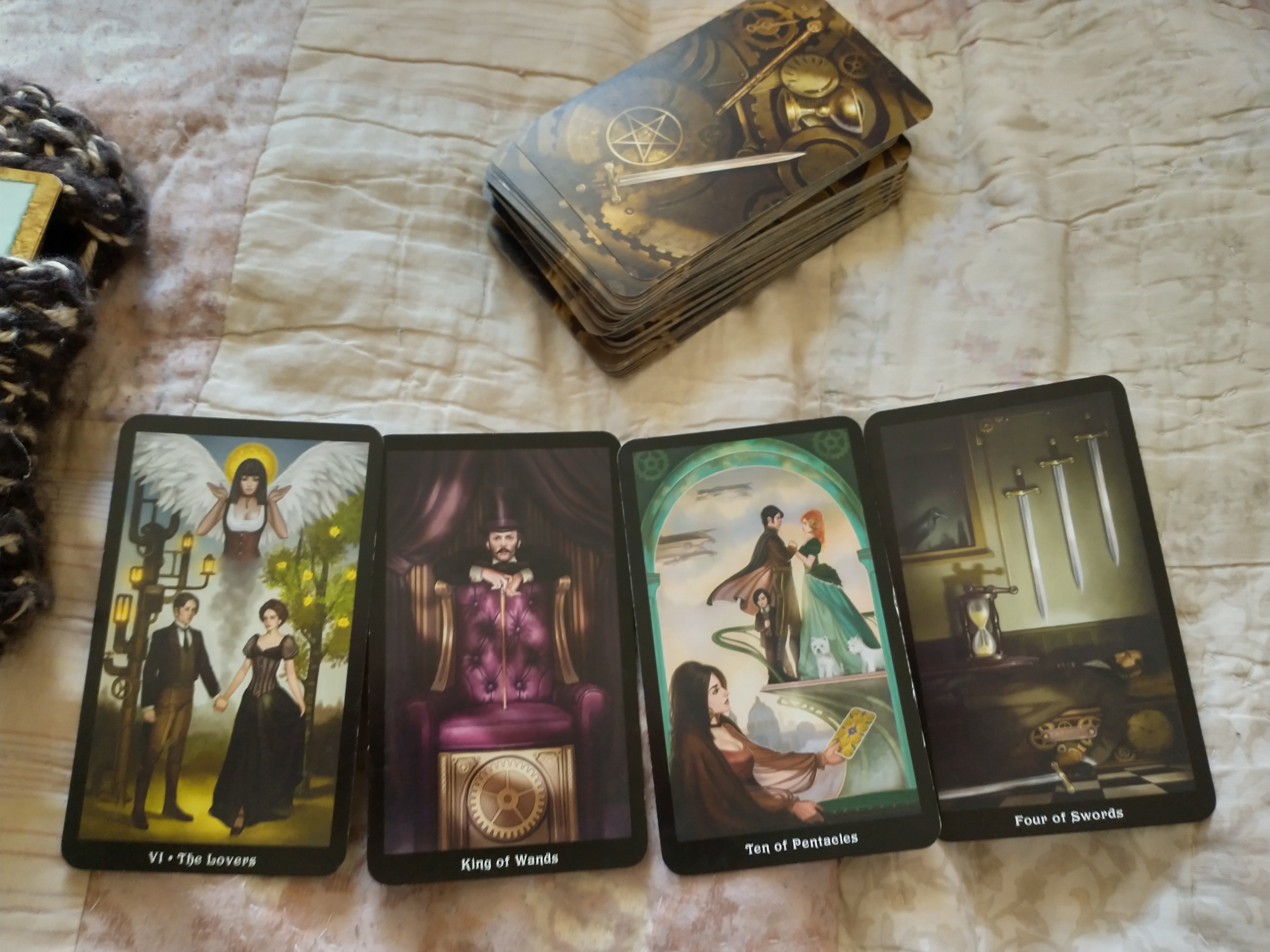 Next, I turned to the Steampunk Tarot (no special reason, I just haven’t read with it in awhile). Once again, just as the last time that I read on this (that time, reading from Mitch McConnell’s point of view, but this time, more generally for everyone’s point of view), the situation is The Lovers. This is what is called for. The two sides of the aisle come together, hold hands, make it work. This is classic politics and it’s what needs to happen to pay the bills of the United States. We know this.