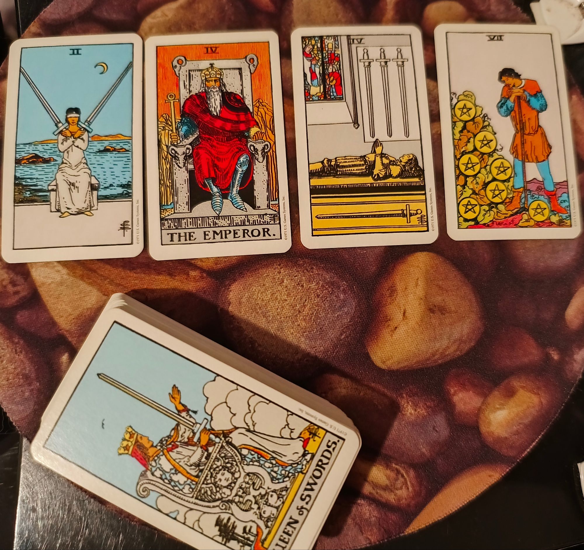 The very first card speaks to the need for meditation, the need to pause at the crossroads and breathe. The situation may not call for such immediate action as the anxiety itself thinks it does. The Emperor as “what to know” has special meaning to me because it’s my birth card, but it’s also an anxiety tell. People who want to control their own little world: These are the anxious. Sometimes the anxious are kind, loving people. Sometimes they are bullies. But either way, the drive at the bottom of the situation is anxiety. Every Emperor or would-be Emperor is damn anxious. Nobody is trying to bully me (except me, myself, and I!). But if anyone is trying to bully you, keep in mind: That person is anxious. Deep down, they are not confident.