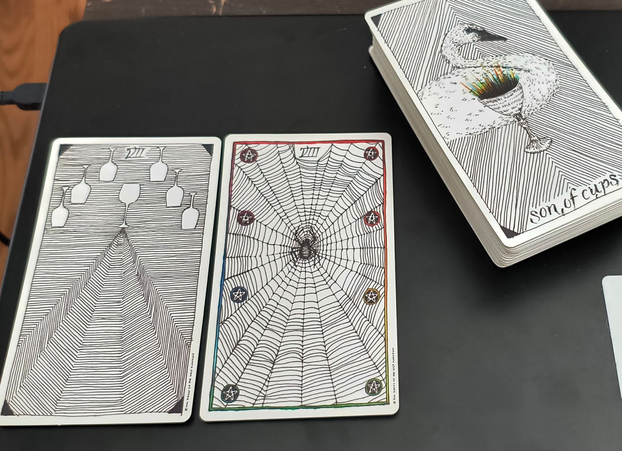 So, in my little two-card spread, the Seven of Cups was the first card, representing the situation being asked about. The second card here, the Eight of Pentacles, is something more to know. Here we have a spider in a web, with eight pentacles caught in that web. To me the spider’s web says that the situation is sticky, that you can get caught in this web. I more typically read this card as about the work it takes for the spider to spin the web; the eight pentacles typically makes me think of work that earns one’s income, but today’s question isn’t about work but about the power dynamics of using a gun. It seems to me that once you draw a gun and point it, you are stuck there in that moment for some amount of time. Perhaps you are stuck because you are in a stand-off of some sort. But if you have fired the gun, you are stuck in a web of consequences, consequences that, the Eight of Pentacles implies, you have earned through your own actions. You are stuck with the aftermath, Son (of Cups, who we see at the bottom of the deck). You are stuck, and perhaps the spider will come over and immobilize you in order to save you for dinner. Maybe you protected somebody and maybe not; maybe you’ll eventually get out of this web and maybe not; either way, you are stuck for the moment, and you can’t really complain (well, you can, but) because you earned that spiderweb.