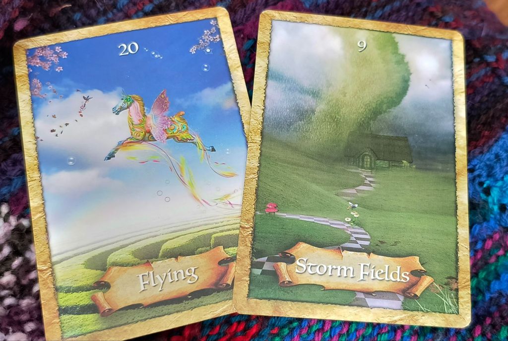 I pulled Flying, showing a psychedelic rainbow winged horse flying through the sky, over a landscape that is covered with a hedge labyrinth, and Storm Fields, which basically shows a tornado bearing down on a house.
