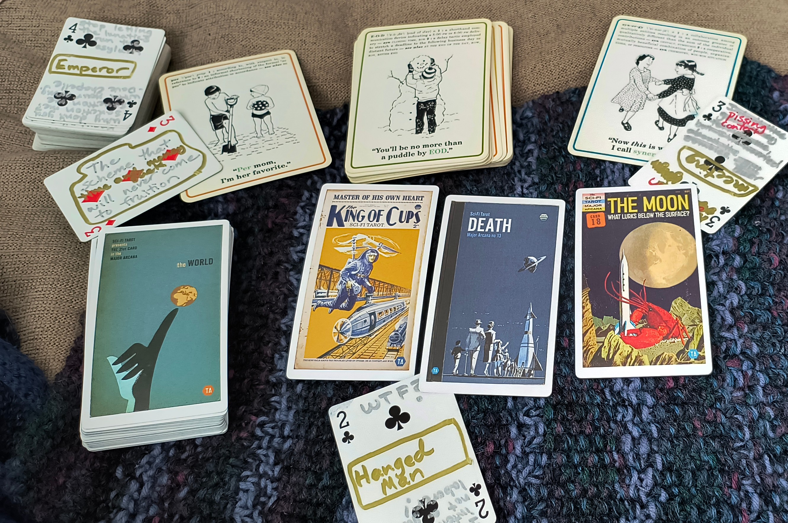 How this looks to me: A lot of dangerous threats. A lot of uncertainty. And a genuinely dangerous moment. Some hints of a possible last minute backing down. The Hanged Man suggesting delay or maybe even restriction, as if others bring about a delay or restriction. The rockets from the Scifi Tarot are on the ground, not in the air. But you can see that I’m grasping hopefully at straws. The Moon is making me think of the Artemis mission and wondering how that could be related. But maybe the Moon, so often connected with fear and uncertainty, as well as with mental problems, is simply indicating these closely related topics here. The appearance of synergy related to meetings may bring a shift as well, as if a coalition forms to affect this outcome.